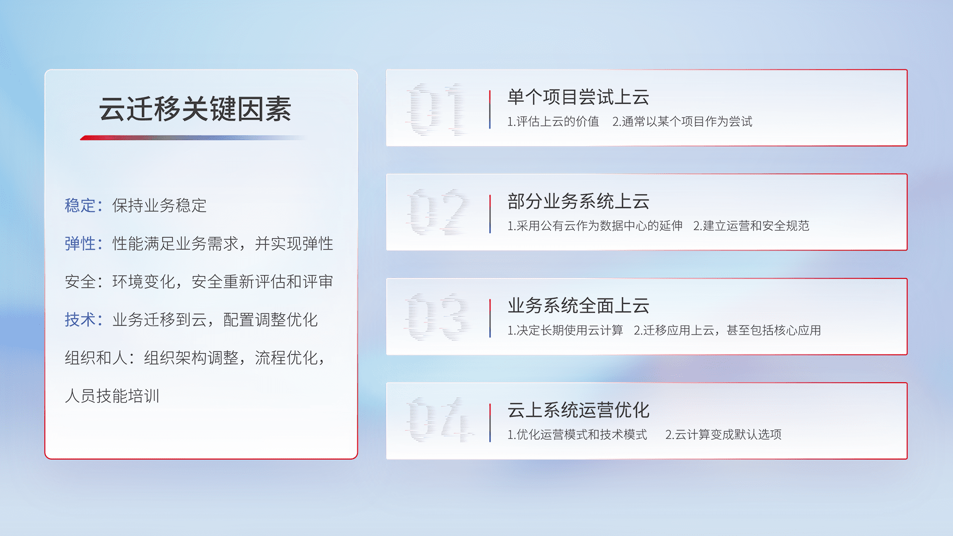 结合实际业务,,,从规划设计、、、云平台选型、、、、云原生改造、、数据迁移、、、集成交付,,,迁移全过程为客户识别最佳上云路径,,,,做好风险识别管理,,,设计网络架构、、身份权限、、、安全审计合规、、、操作审计、、、日志审计、、、、监控告警策略、、多站点容灾设计等,,,,对云上基础设施进行整体规划,,,提升IT治理水平,,以满足弹性、、、高可用、、、高性能的需求。。。。